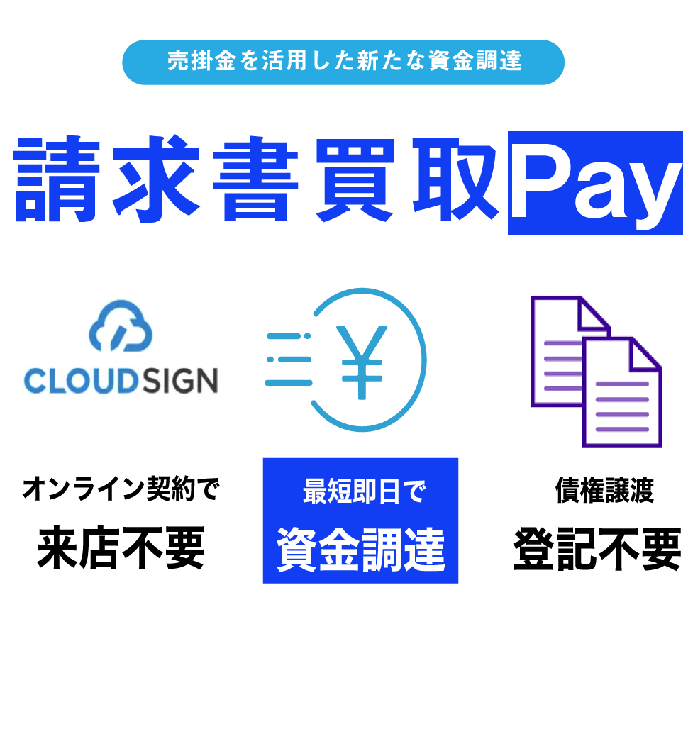 請求書買取payは売掛債権を買い取る事により、売掛金から手数料を差し引かれた金額を早期に資金化できるため安定した資金繰りを実現することが可能になります。