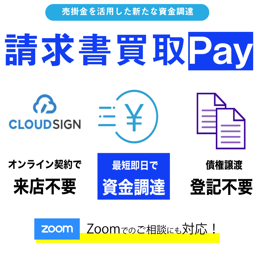 請求書買取payは売掛債権を買い取る事により、売掛金から手数料を差し引かれた金額を早期に資金化できるため安定した資金繰りを実現することが可能になります。